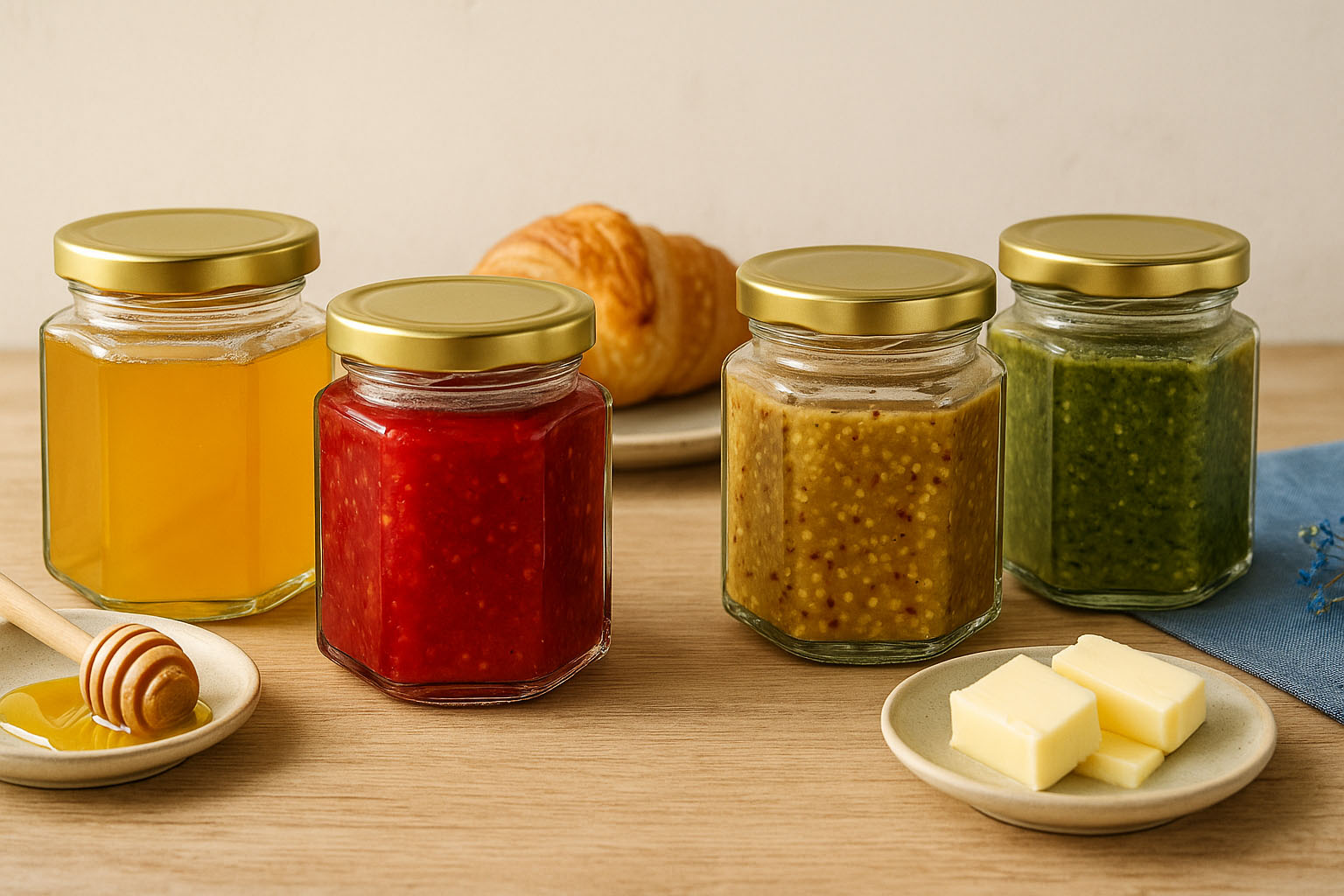 Borcanele elegante cu formă hexagonală combină un design estetic cu o funcționalitate practică. Baza lor hexagonală le conferă un aspect special și, în același timp, permite o depozitare care economisește spațiu. Fabricate în Europa, acestea impresionează prin calitatea superioară a execuției și versatilitate. Fie că este vorba de paste aromate, pesto picant, gemuri fructate sau miere rafinată – aceste borcane oferă ambalajul perfect pentru diverse specialități.