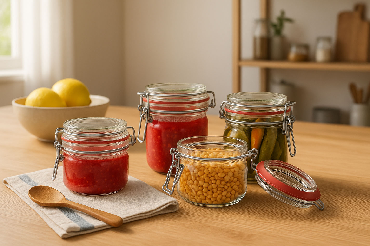 Borcanele cu clemă sunt ideale pentru fierberea și conservarea specialităților făcute în casă, precum gemuri, chutney-uri sau legume murate. De asemenea, oferă o soluție igienică și elegantă pentru depozitarea alimentelor uscate, cum ar fi musliul, făina sau leguminoasele.