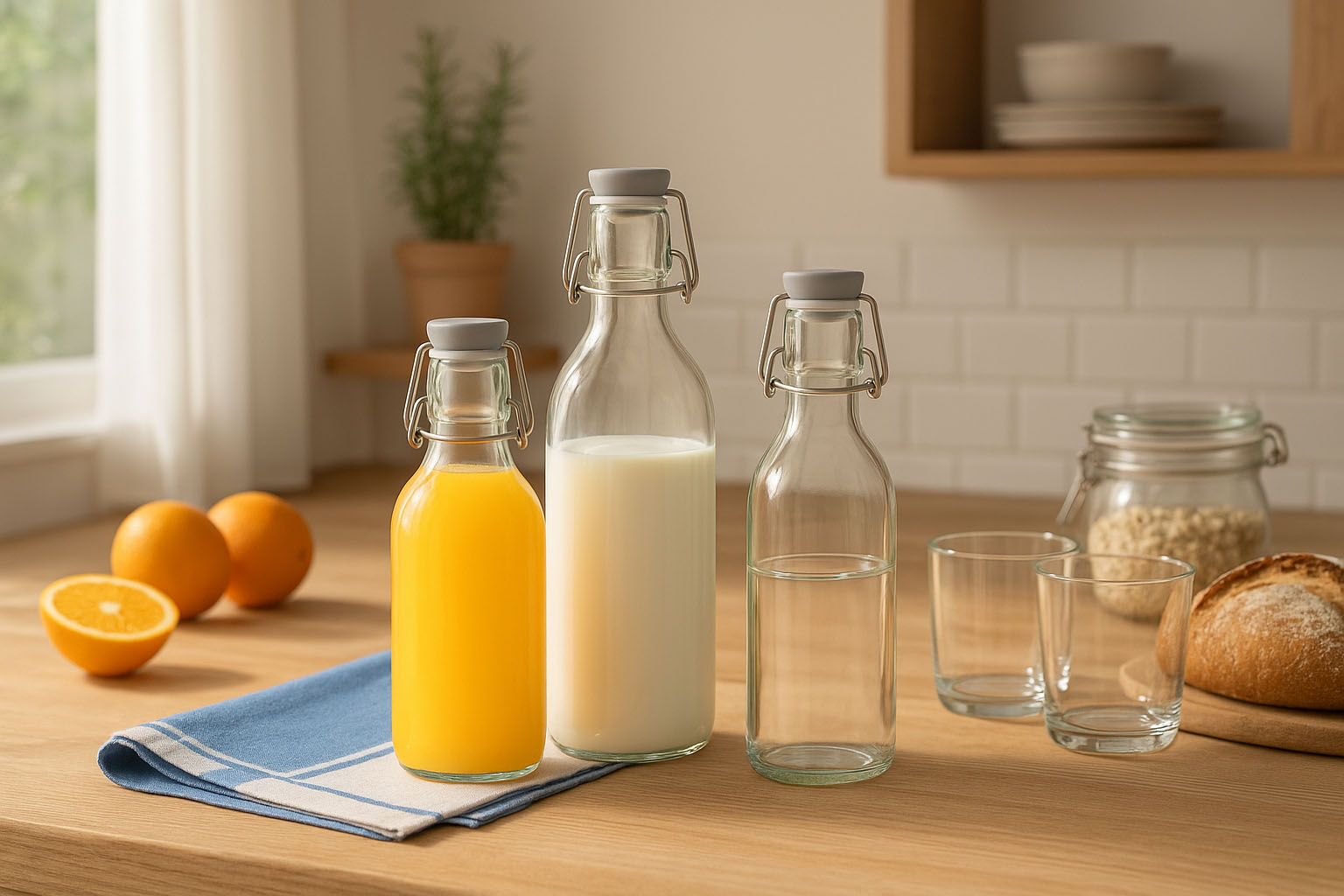 Datorită designului său universal, seria „Emilia“ este perfectă pentru suc, lapte, vin și multe alte produse lichide. Fie pentru uz zilnic în bucătărie, în domeniul gastronomic sau ca ambalaj sustenabil pentru produse de calitate superioară – ea combină o prezentare stilată cu o utilizare practică.